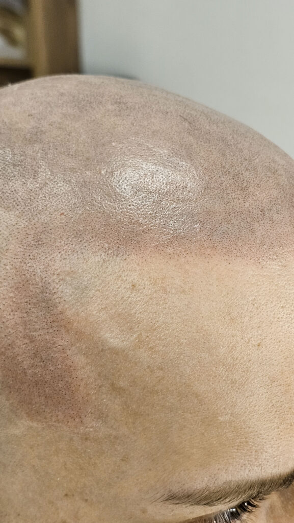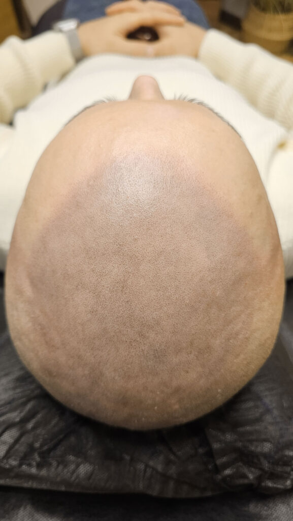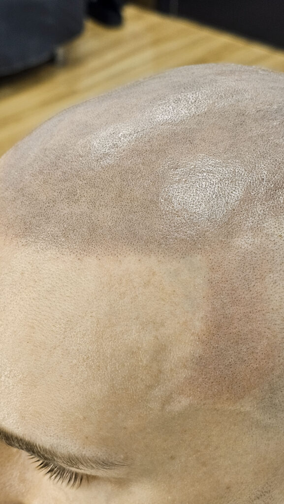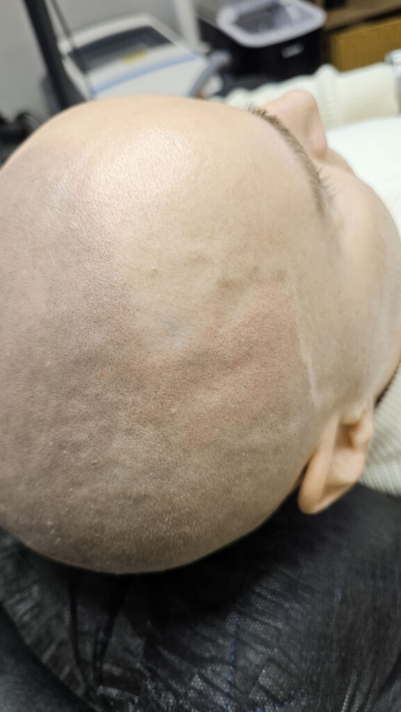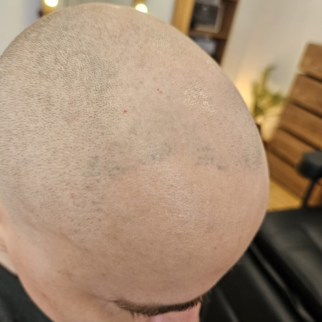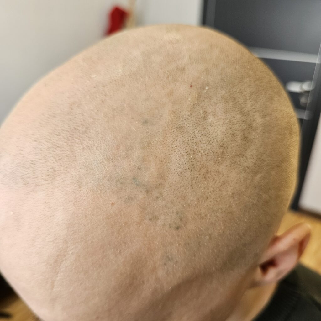 Клиент из Краснодара. Изначально попал ко мне с косячной трихопигментацией от другого мастера, причем обидно что косяк был на фронтальной линии и это нельзя было обыграть. В общем надо было удалять. Я приступил к удалению и выполнил 3 процедуры удаления. Темный пигмент удалился но остались пятна зеленоватого оттенка (предыдущий мастер мешала пигменты разных цветов, и это их остаток). Как только я это увидел, то уже отправил клиента на другой более дорогой пикасекундный лазер, способный удалять такие оттенки. Мой лазер удаляет только оттенки черного и красного цветов. На другом лазере клиент сделал около 5 удалений и к сожалению пятна еще были видны, но мы решили уже приступать, их не так видно(но если присмотреться то можно заметить). Вроде бы косячных точек мало и казалось что быстро удалим, на деле нет. Удаление заняло год. Но в конечном итоге сделали «правильную» трихопигментацию и клиент конечно был очень доволен результатом)